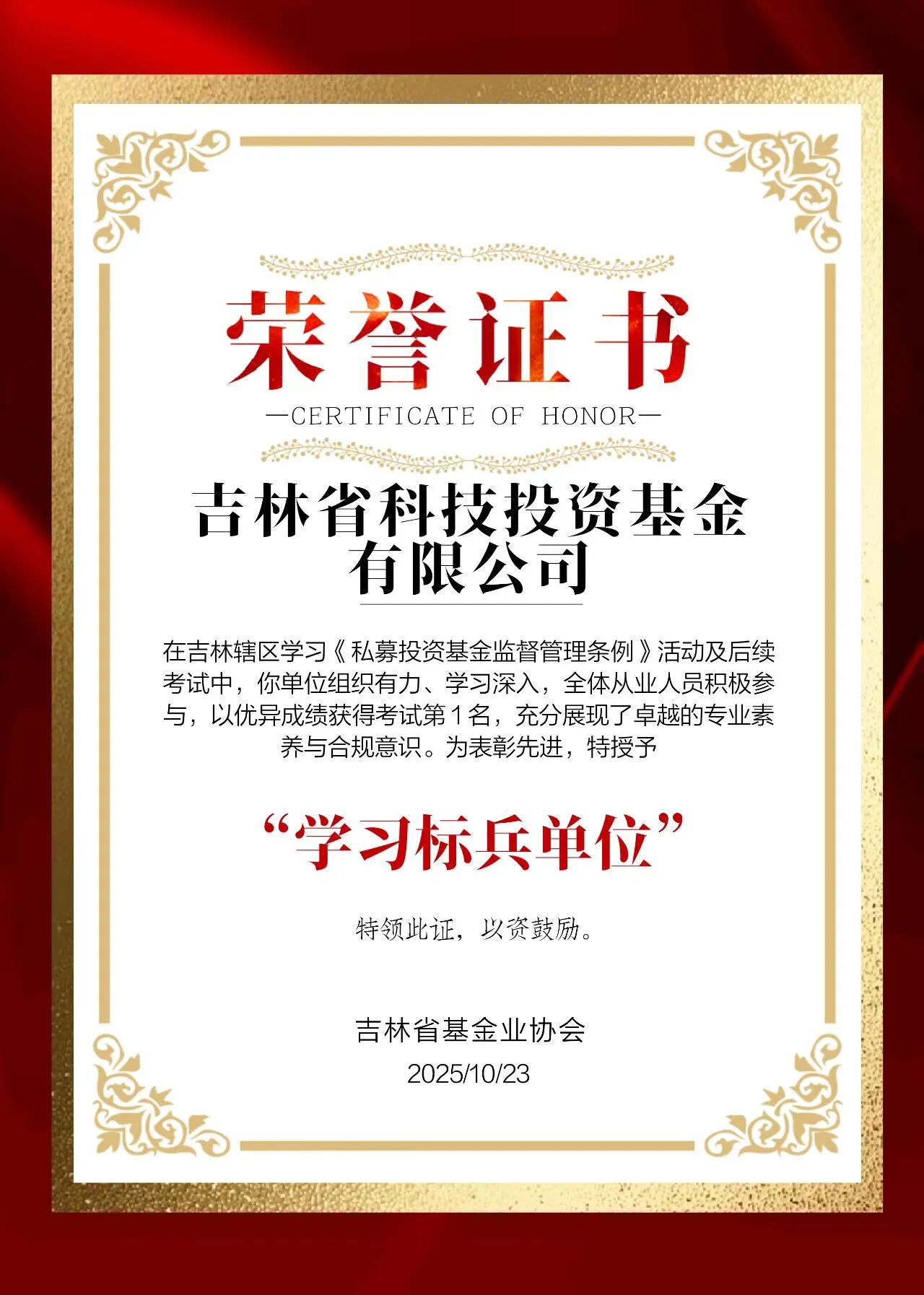 我公司榮獲吉林省基金業(yè)協(xié)會(huì)《私募投資基金監(jiān)督管理?xiàng)l例》知識(shí)競(jìng)賽第一名,獲評(píng)“學(xué)習(xí)標(biāo)兵單位”